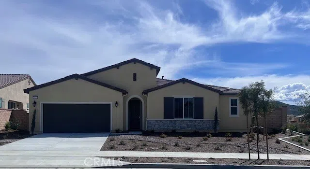 Last opportunity to purchase the ever popular JULIA floorplan, located at NOBLE in the beautiful masterplan of Audie Murphy Ranch in Menifee. The gourmet kitchen includes white maple shaker style cabinetry, hardware in satin nickel, a professional hood, custom tile full backsplash, an immense walk-in pantry and large center island. The primary bathroom features a custom marble super shower, separate vanities and large walk in closet. You will appreciate an over sized formal dining room ( that could also be used as a game room, living room, kids playroom or media room). The Secondary bedrooms that share a Hollywood bathroom each have their own vanity area and walk in closets. The flooring design includes a combination of 6" x 35" wood looking tile throughout and carpet only in bedrooms. Additional features include a flex room off the kitchen (perfect for a desk area) , a covered courtyard, 8 ft interior door frames, generous recessed LED lighting, ceiling fan prewires in all bedrooms, flex & great room and window coverings. This lot is approx. 8,500 sq ft located on a corner lot.