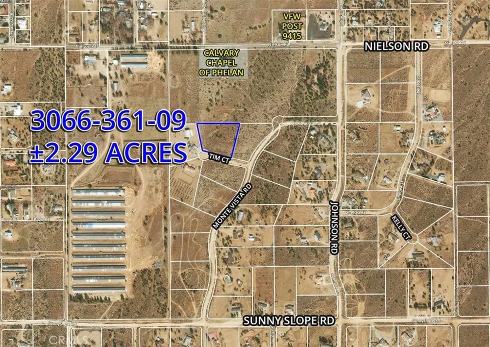 APN 3066-361-09 is a cul-de-sac parcel on the north side of Tim Court, west of Monte Vista Road. Adjacent to an established home at the west border of the site with power, buyer to verify all utilities. Multiple Rural Residential Lots For Sale in the beautiful rural area of Phelan, San Bernardino County, CA. Enjoy spacious parcels with plenty of room for private, quiet living in an established rural neighborhood. Views of distant mountains to the south make this a desirable place to have a home. Quick access to grocery, conveniences and schools.